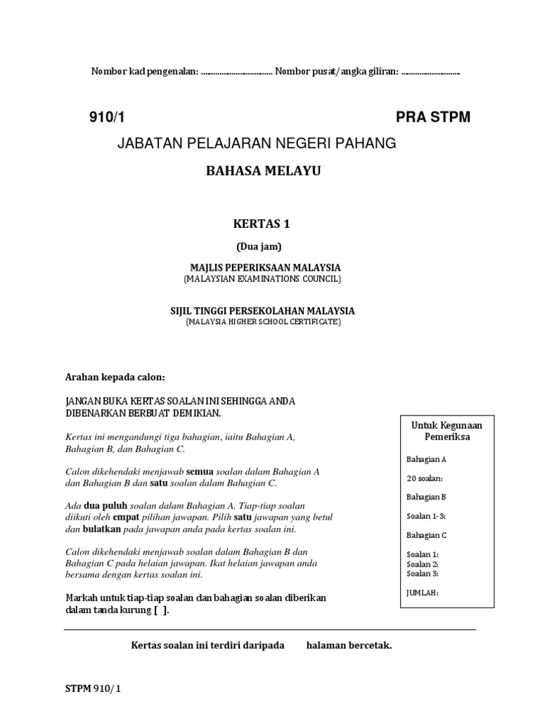 Format esei pbs bahasa melayu stpm. Penjenamaan Semula Tingkatan Enam dalam Pelan Pembangunan Pendidikan 2013-2025. Koleksi Kertas Soalan Peperiksaan.
